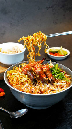 Mi telur,ayam, udang, tauge, kuah santan pedas